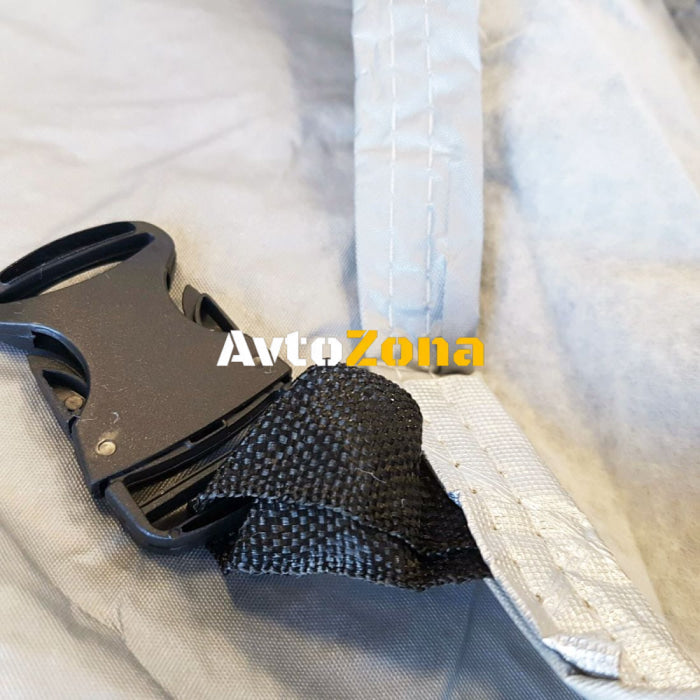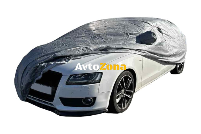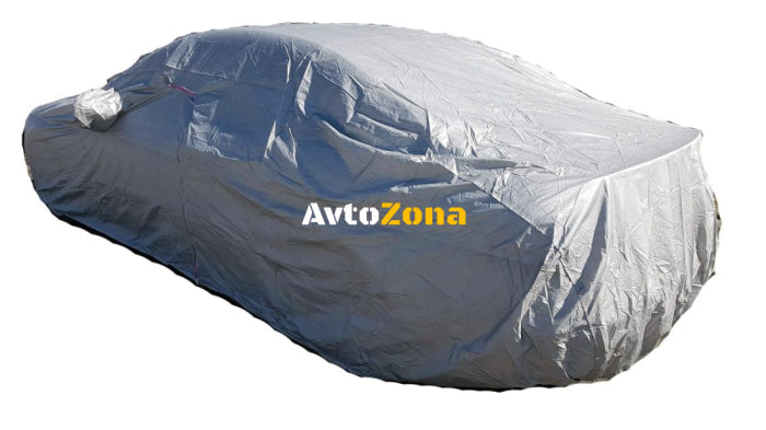 Αδιάβροχο, ηλιοπροστατευτικό, υψηλής ποιότητας κάλυμμα αυτοκινήτου με επένδυση από μαλακή βάτα, με φερμουάρ στην πόρτα του οδηγού, με ζώνη σύσφιξης και λάστιχο κάτω από τον μπροστινό και τον πίσω προφυλακτήρα.